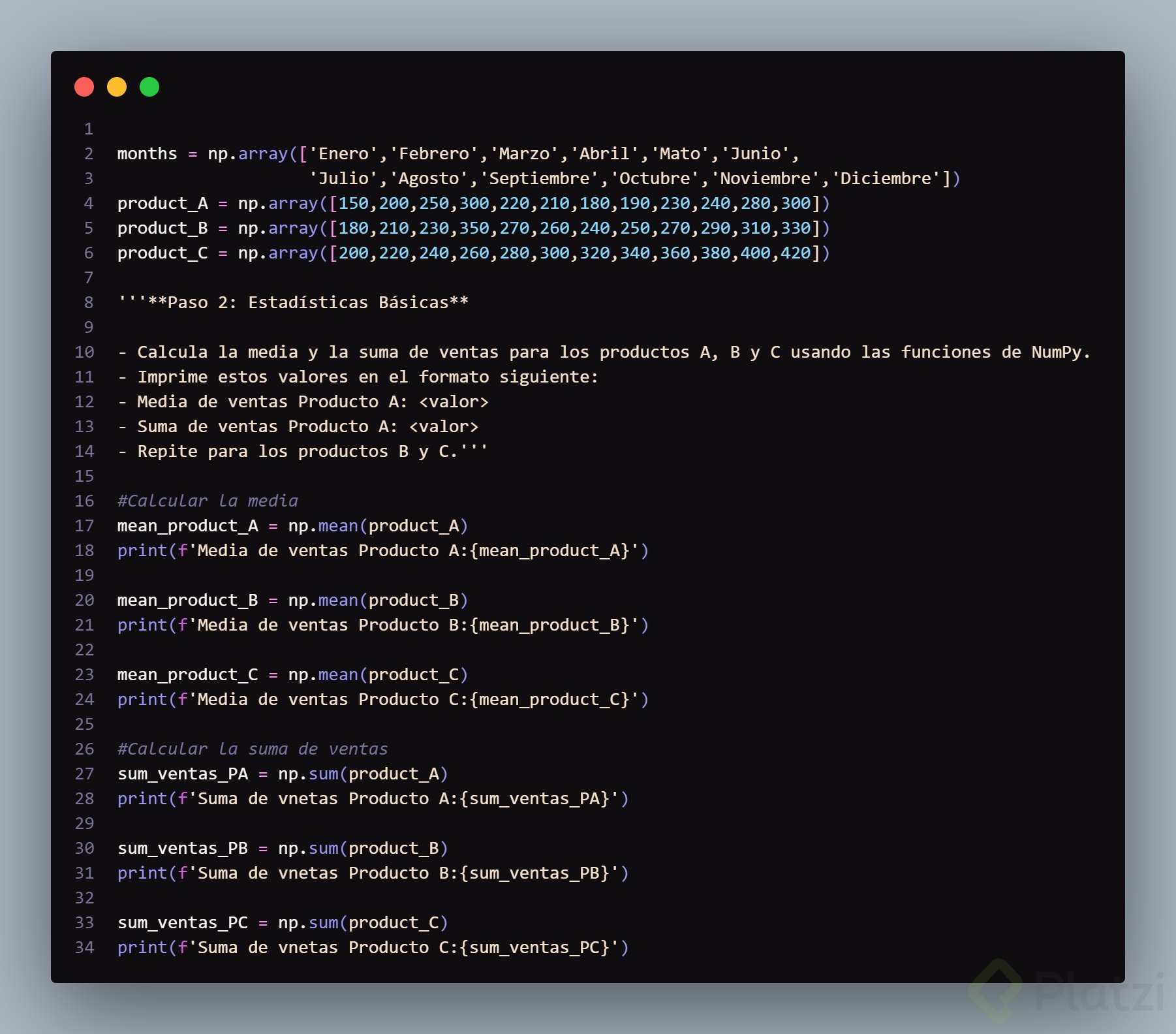 - Calcula la media y la suma de ventas para los productos A, B y C usando las funciones de NumPy.