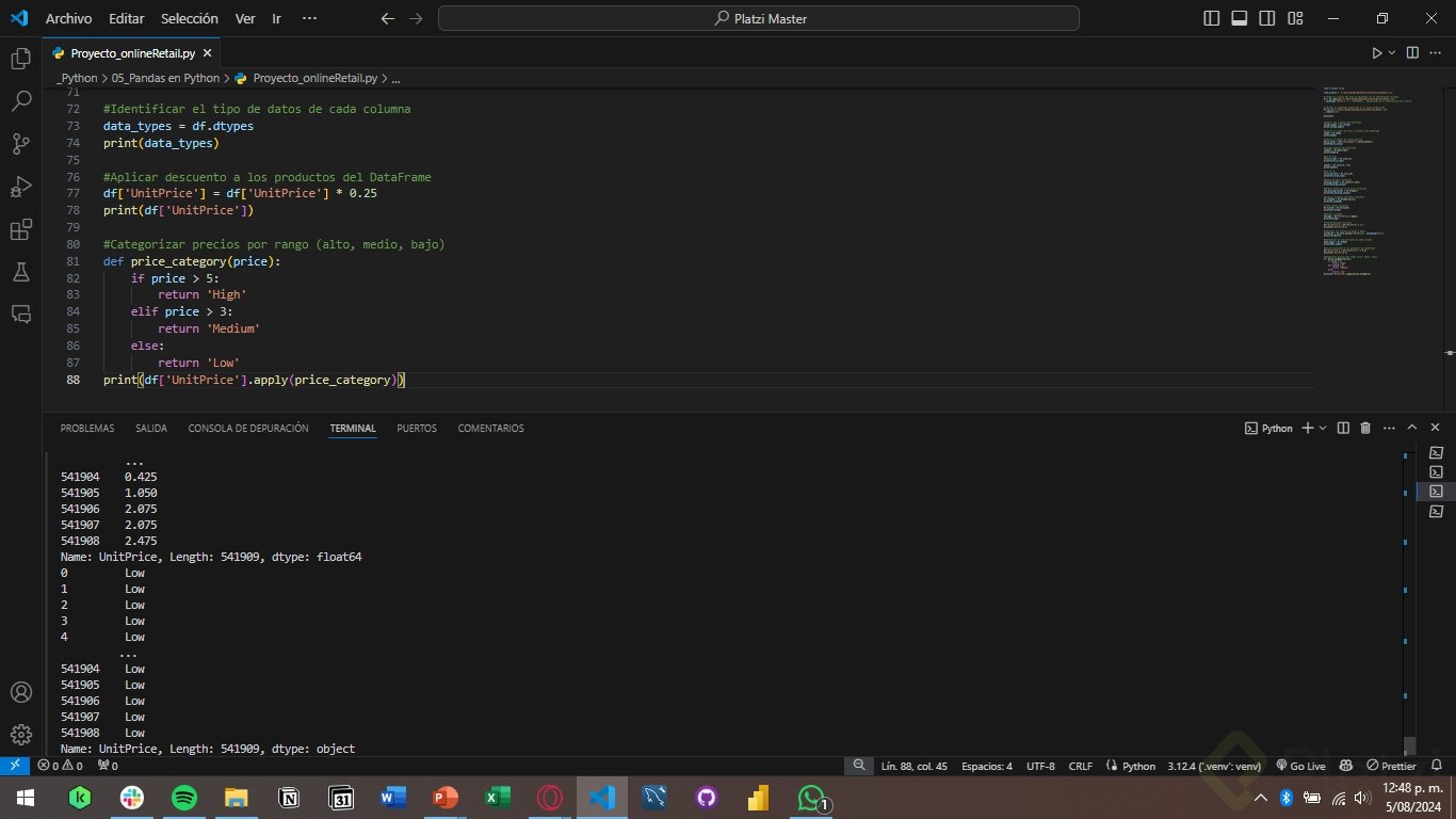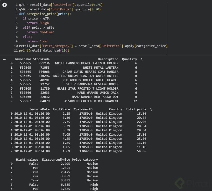 Con esta función, el UnitPrice se categoriza en 'High', 'Medium' o 'Low' basado en su valor. Esto ayuda a segmentar fácilmente los datos para análisis más detallados.