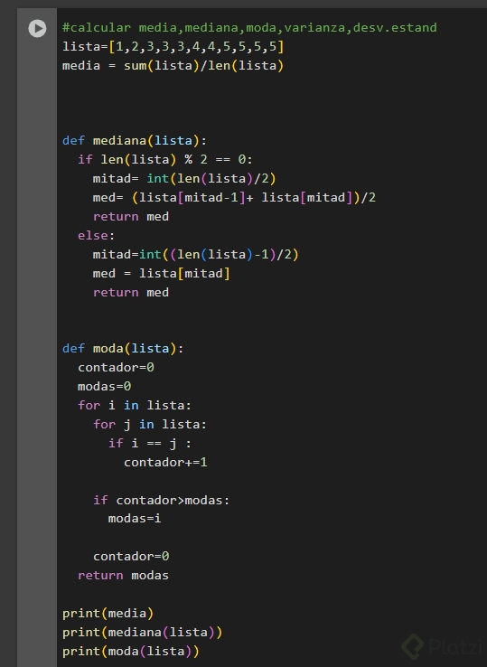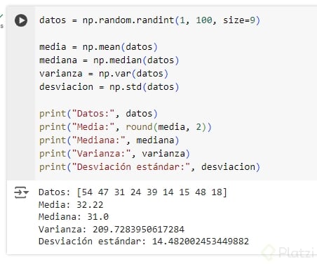 pythonCopiar código import numpy as np datos = np.array([23, 76, 35, 67, 89, 45, 68, 79, 35]) media = np.mean(datos) mediana = np.median(datos) varianza = np.var(datos) desviacion = np.std(datos) print("Media:", media) print("Mediana:", mediana) print("Varianza:", varianza) print("Desviación estándar:", desviacion)