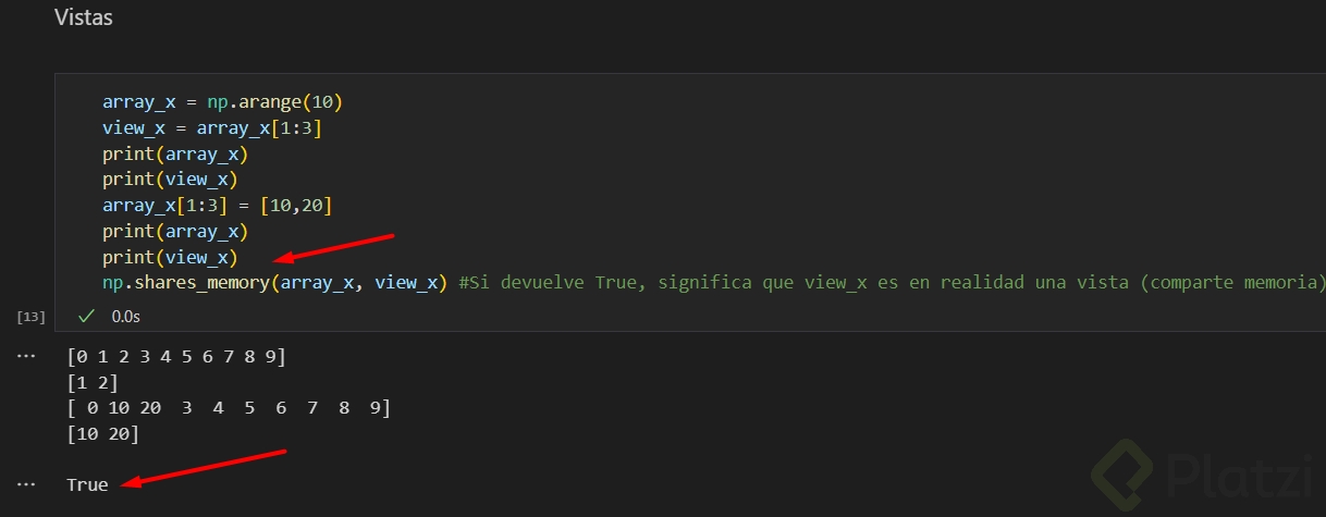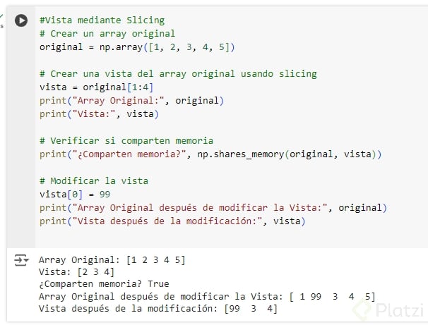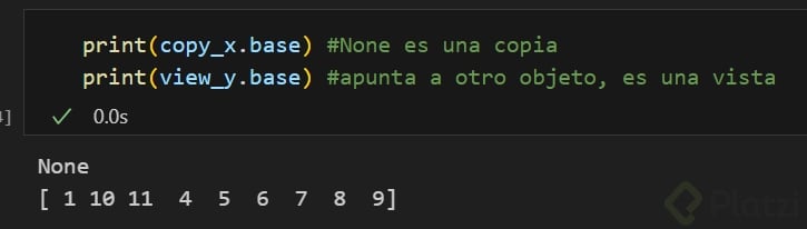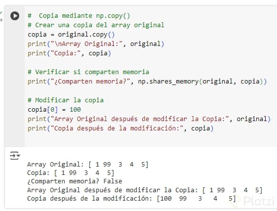 Aquí, modificar x no afecta a copia, ya que es independiente del array original. Esto resalta la importancia de distinguir entre vistas y copias en NumPy.