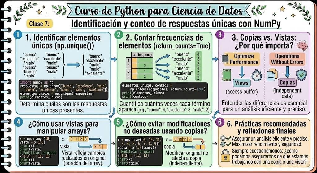 NumPy ofrece herramientas potentes para el análisis de datos, desde la identificación de elementos únicos hasta el manejo de vistas y copias. Aprovechar estas funcionalidades asegura un análisis eficiente y preciso. Al crear copias de datos y usar vistas adecuadamente, maximizamos tanto el rendimiento como la seguridad de nuestras operaciones. Siempre cuestionémonos: ¿cómo podemos asegurarnos de que estamos trabajando con una copia o una vista? Esta reflexión nos permitirá mejorar continuamente en el uso de NumPy. ¡Anímate a dejar tus experiencias y preguntas en los comentarios!