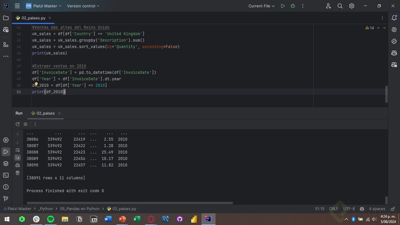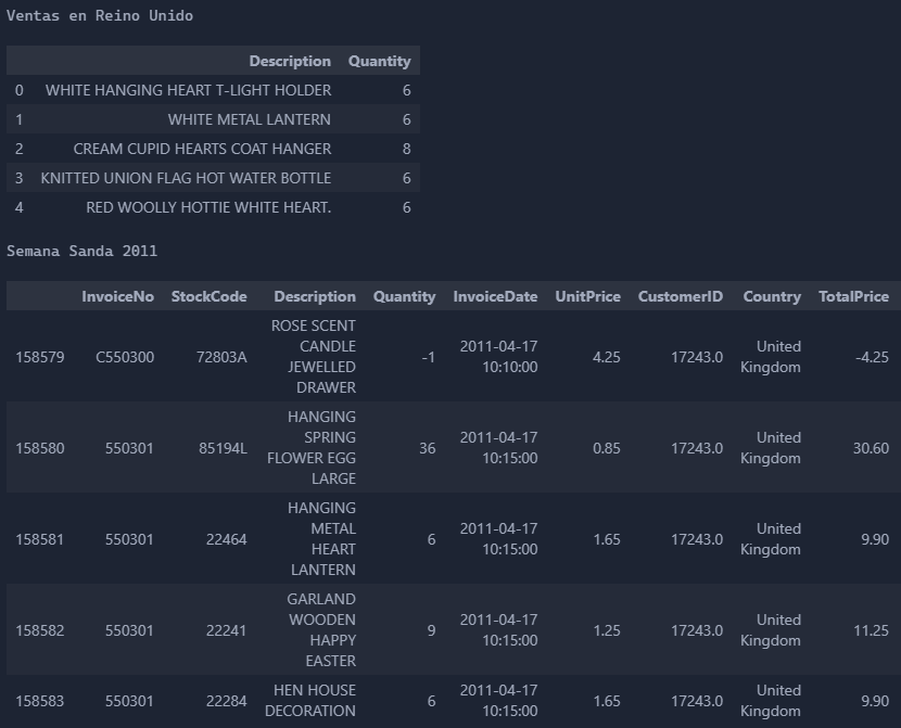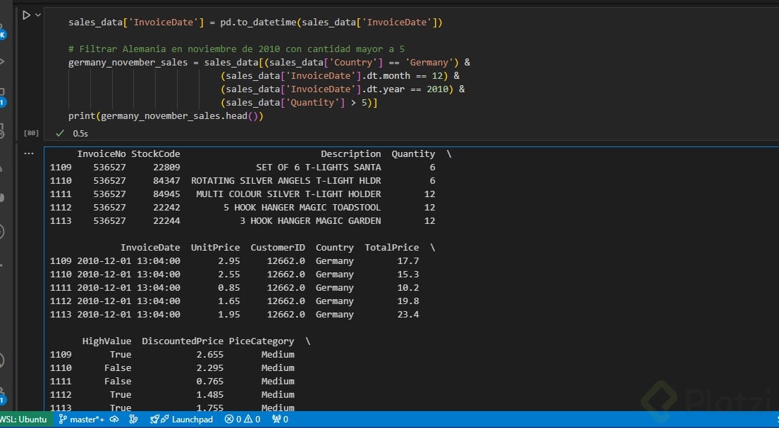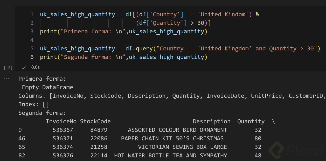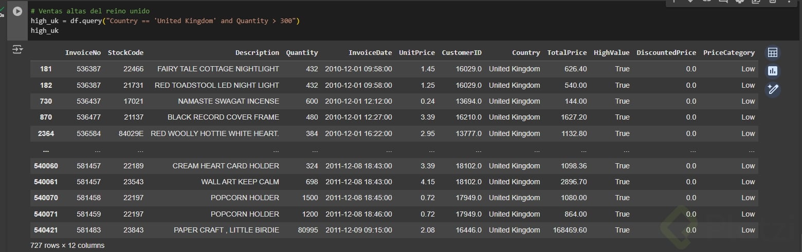 Para realizar filtrado de datos, primero debemos importar la librería Pandas y tener un DataFrame ya cargado. Supongamos que queremos filtrar las ventas realizadas en el Reino Unido. El proceso es el siguiente: