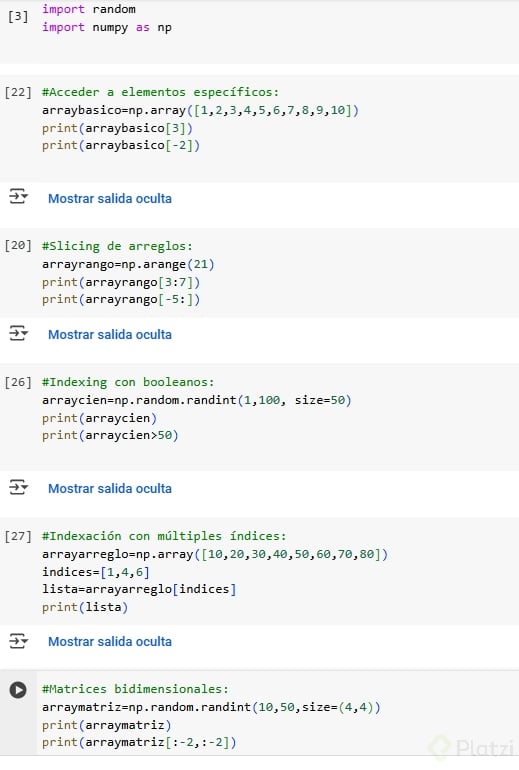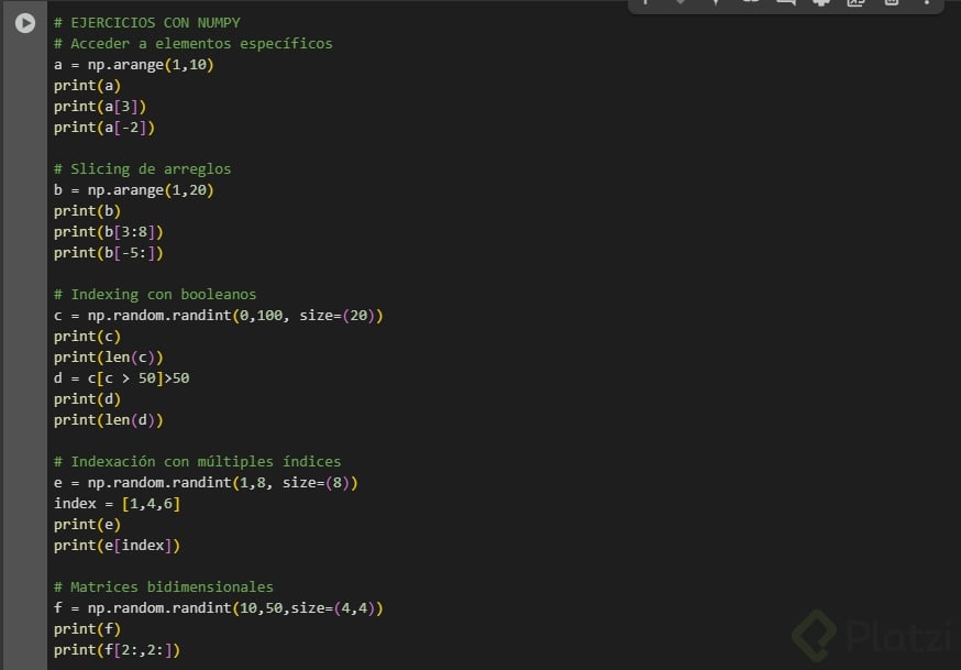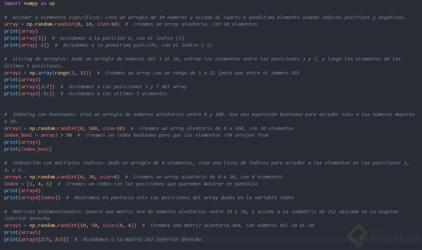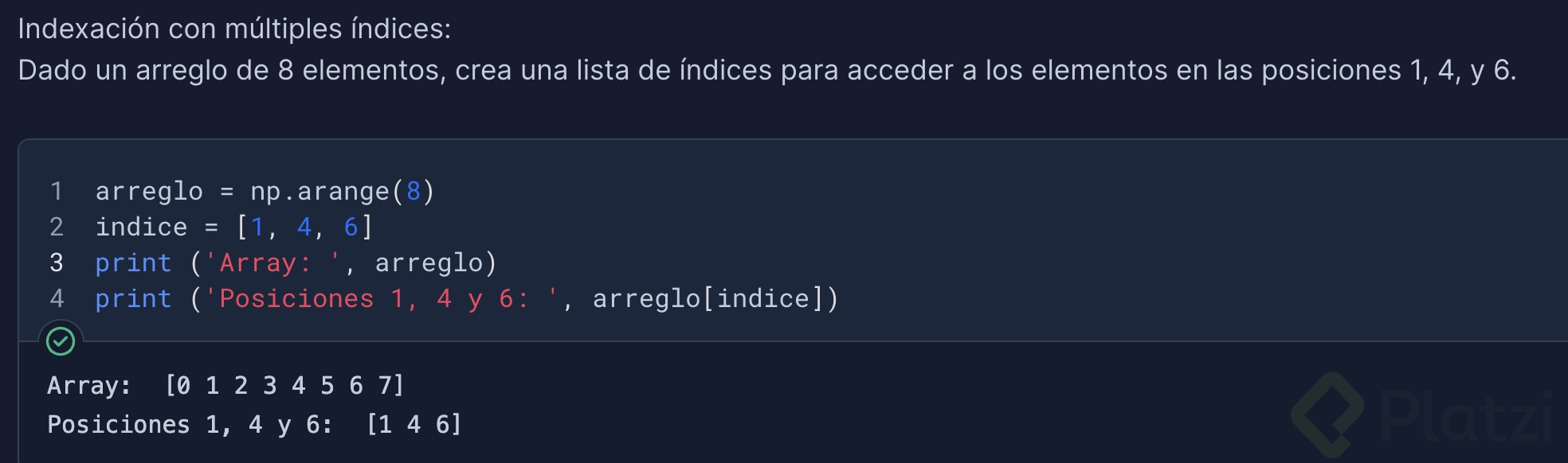 - Dado un arreglo de 8 elementos, crea una lista de índices para acceder a los elementos en las posiciones 1, 4, y 6.