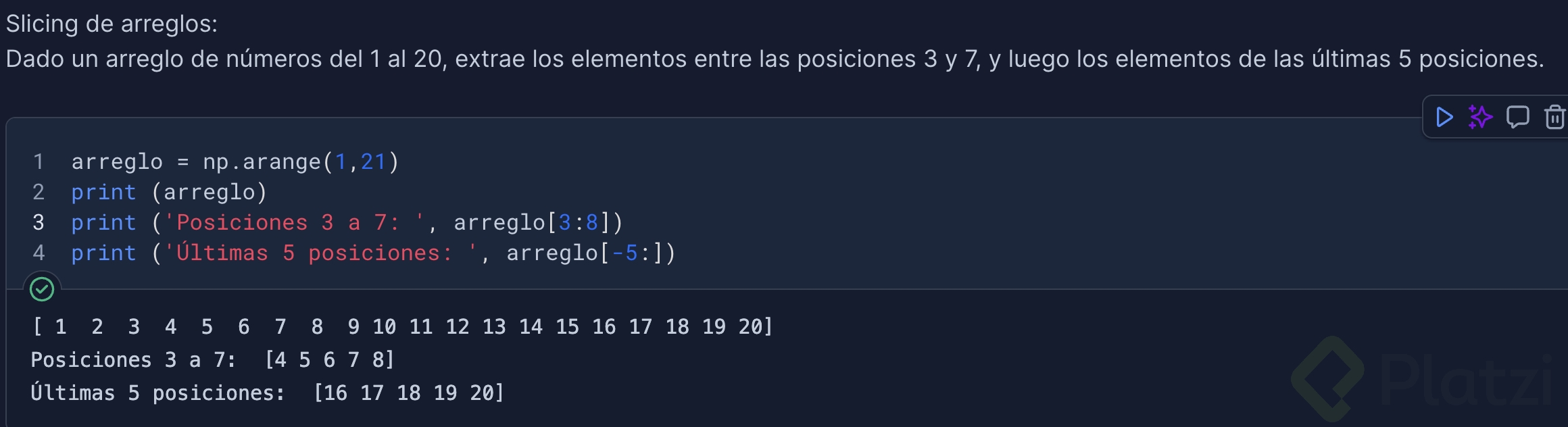 - Dado un arreglo de números del 1 al 20, extrae los elementos entre las posiciones 3 y 7, y luego los elementos de las últimas 5 posiciones.