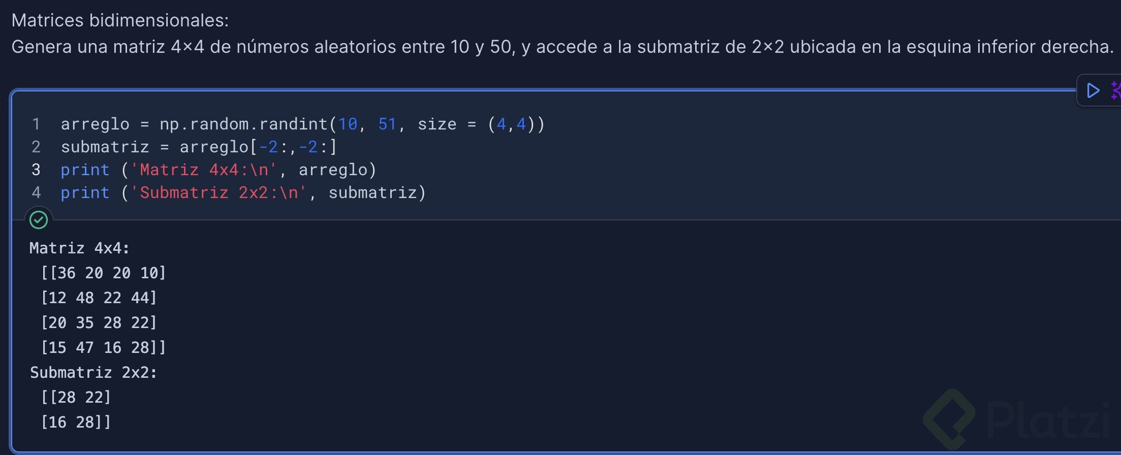 - Genera una matriz 4x4 de números aleatorios entre 10 y 50, y accede a la submatriz de 2x2 ubicada en la esquina inferior derecha.