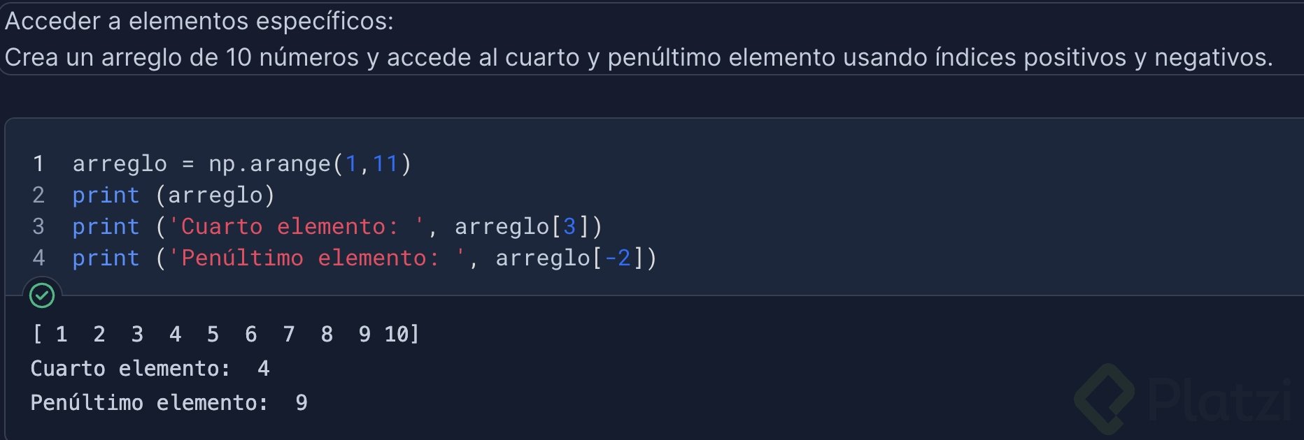 - Crea un arreglo de 10 números y accede al cuarto y penúltimo elemento usando índices positivos y negativos.