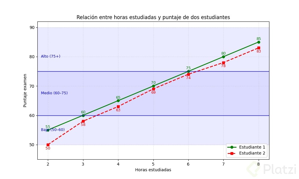El objetivo es visualizar la relación entre las horas estudiadas y los puntajes obtenidos por dos estudiantes en un examen. A lo largo de este ejercicio, aprenderás a configurar el tamaño del gráfico, trazar múltiples series de datos, personalizar las líneas y marcadores, y agregar anotaciones para destacar puntos importantes en la visualización.