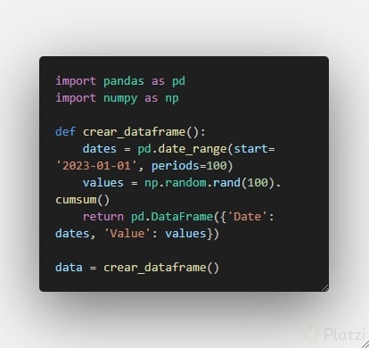 Primero, generamos un conjunto de fechas y valores aleatorios para simular los datos de ventas a lo largo del tiempo: