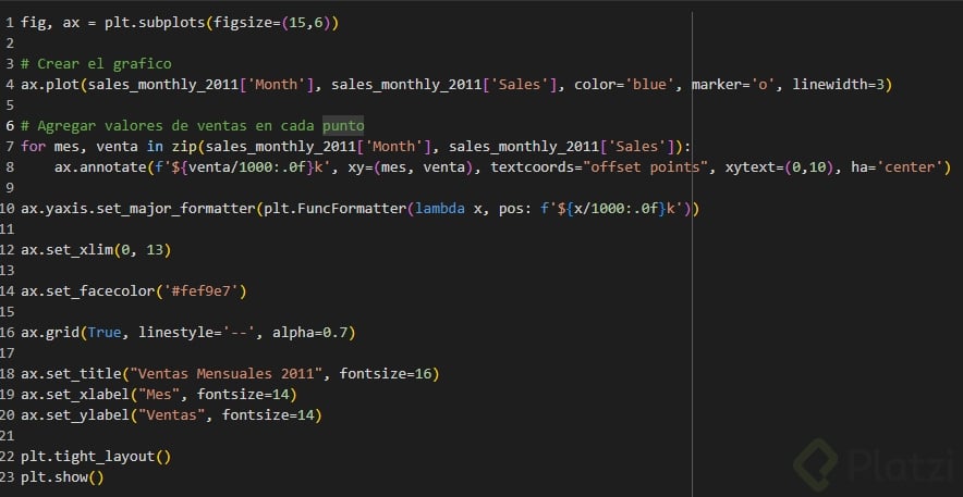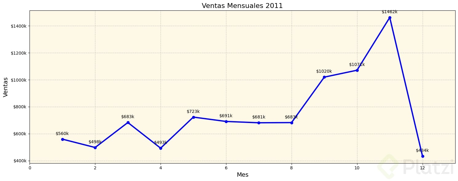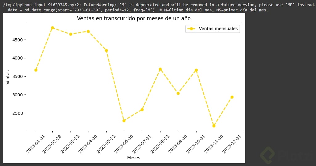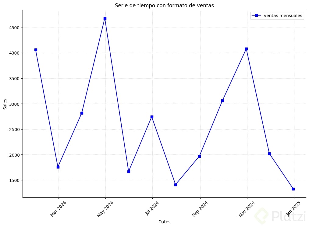 Una vez que hemos cubierto lo básico, podemos aplicar estos conceptos a diferentes contextos más avanzados para mostrar ventas mensuales o analizar patrones estacionales, por ejemplo. Aquí te dejo un ejemplo focalizado en ventas mensuales: