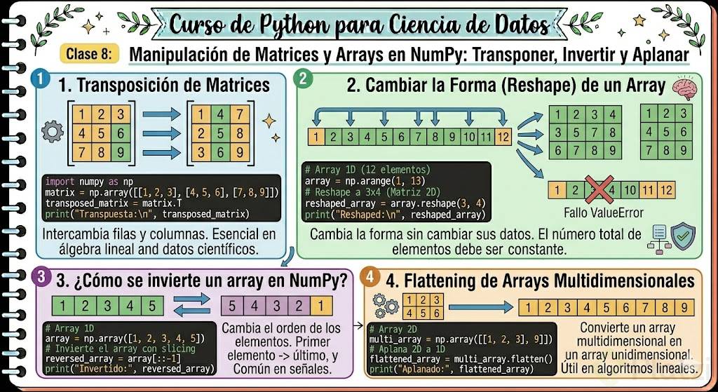 Aprender a transponer y transformar matrices, invertir arrays y aplanar arrays multidimensionales son habilidades esenciales para manejar grandes volúmenes de datos y realizar cálculos complejos de manera eficiente. Usando la librería NumPy en Python, estas operaciones no solo son fáciles de implementar sino también altamente optimizadas para trabajar con grandes conjuntos de datos.