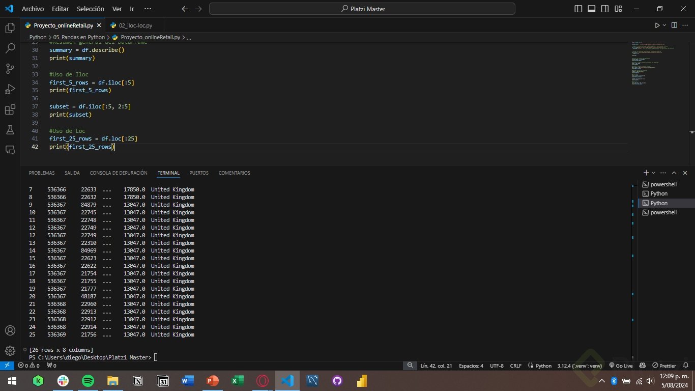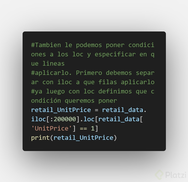 loc, el índice final es inclusivo.retail_data.loc[0:4]selecciona 5 filas, incluyendo la fila con índice 4. -