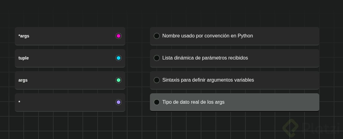 Los argumentos dinámicos permiten recibir un número variable de parámetros posicionales. En Python se definen con un asterisco y el nombre convencional args. Internamente, args es una tupla: inmutable, ordenada y accesible por índice.