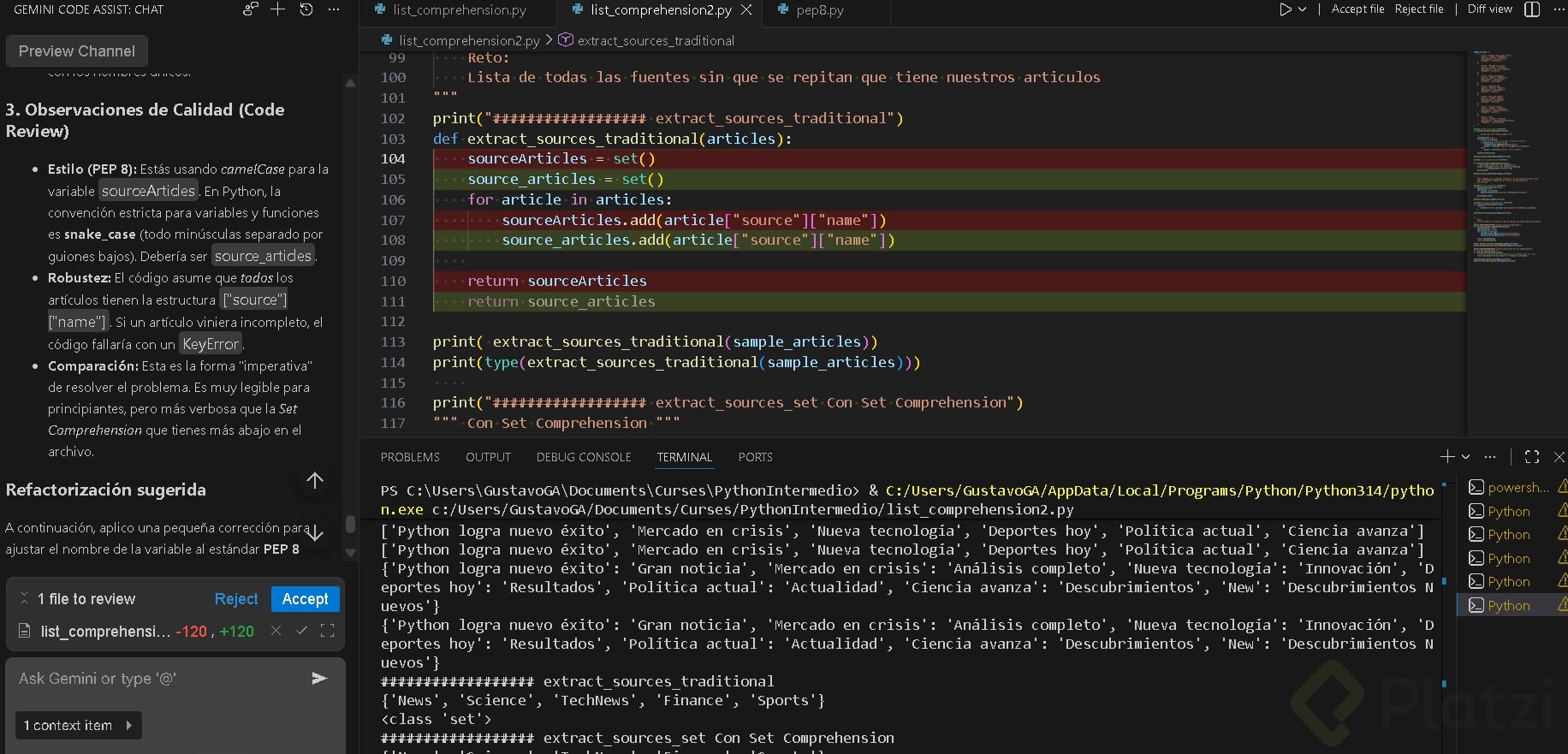 Las comprensiones en Python permiten escribir código más claro y conciso para procesar listas, diccionarios y sets. Aquí verás cómo extraer fuentes únicas y cómo categorizar artículos por su fuente usando set, list comprehension y dict comprehension. El enfoque prioriza legibilidad, evitar duplicados y menos código sin cambiar la lógica.