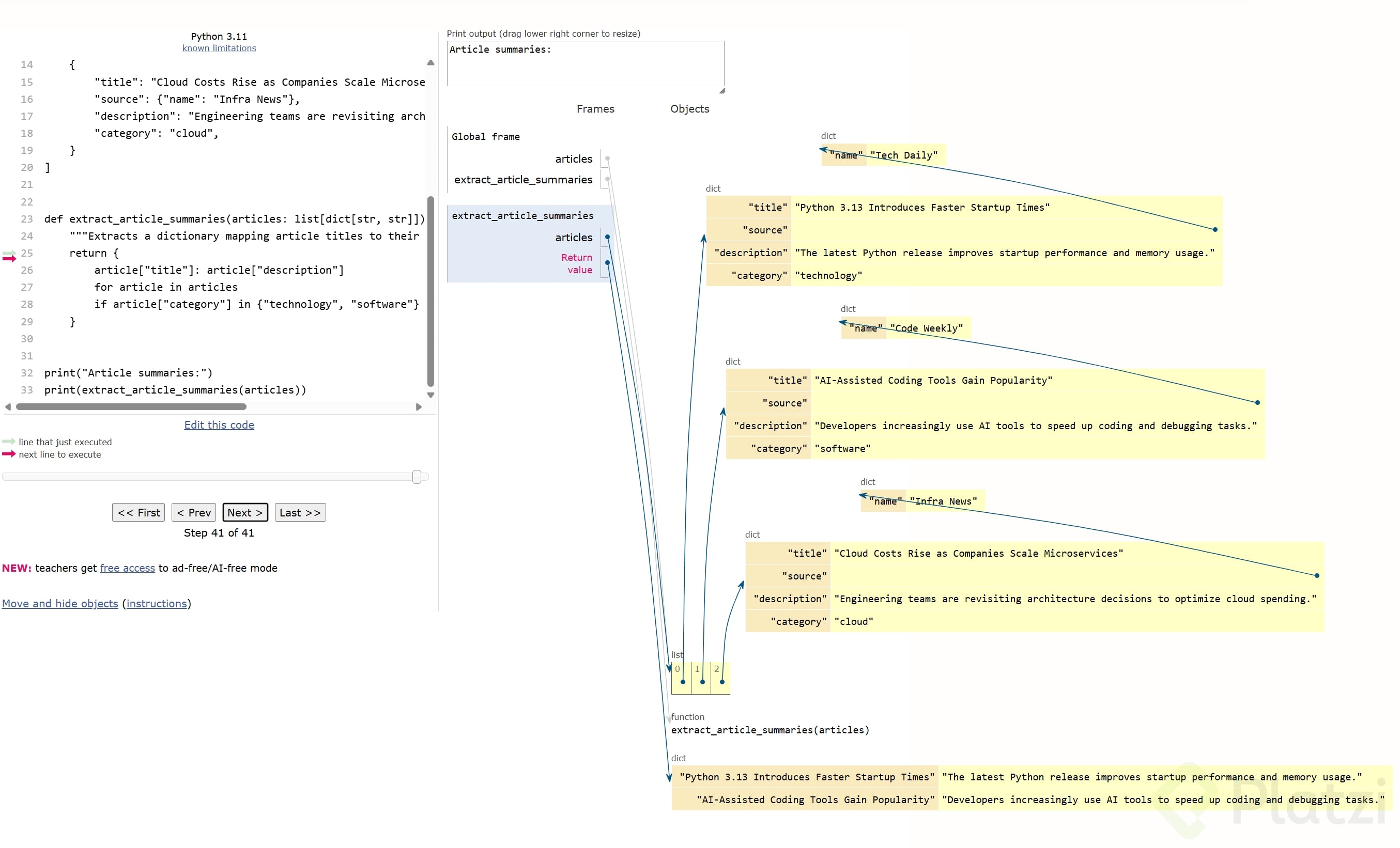 # versión con comprensiones anidadasdefcategorize(articles):return{ source:[ article