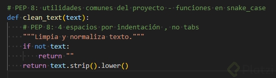 Funciones y variables en snake_case: nombres claros y descriptivos.