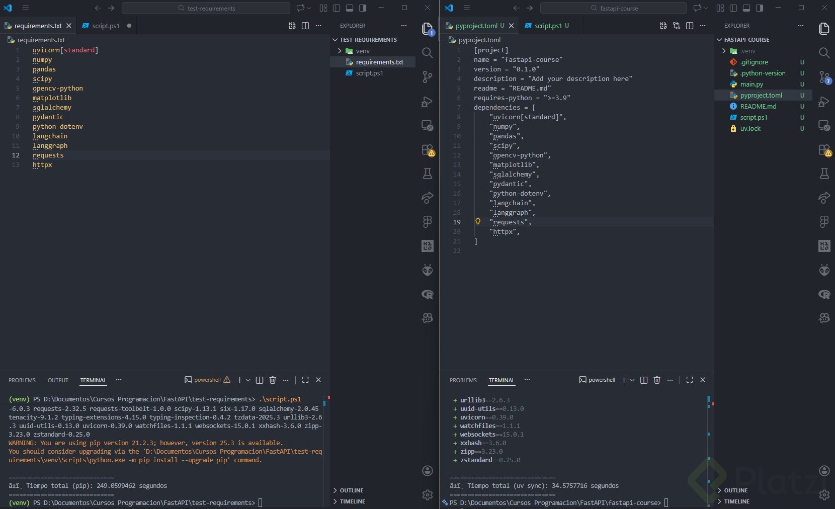 - si tienes un requirements TXT, compáralo con pyproject para evaluar rendimiento.
