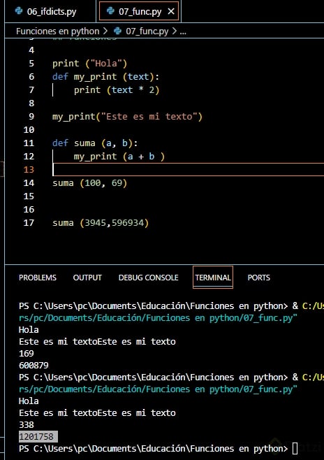 Al llamar a esta función suma(1, 5), imprimirá 6 en la terminal. Esto nos muestra cómo una función puede manejar múltiples parámetros y realizar operaciones con ellos.