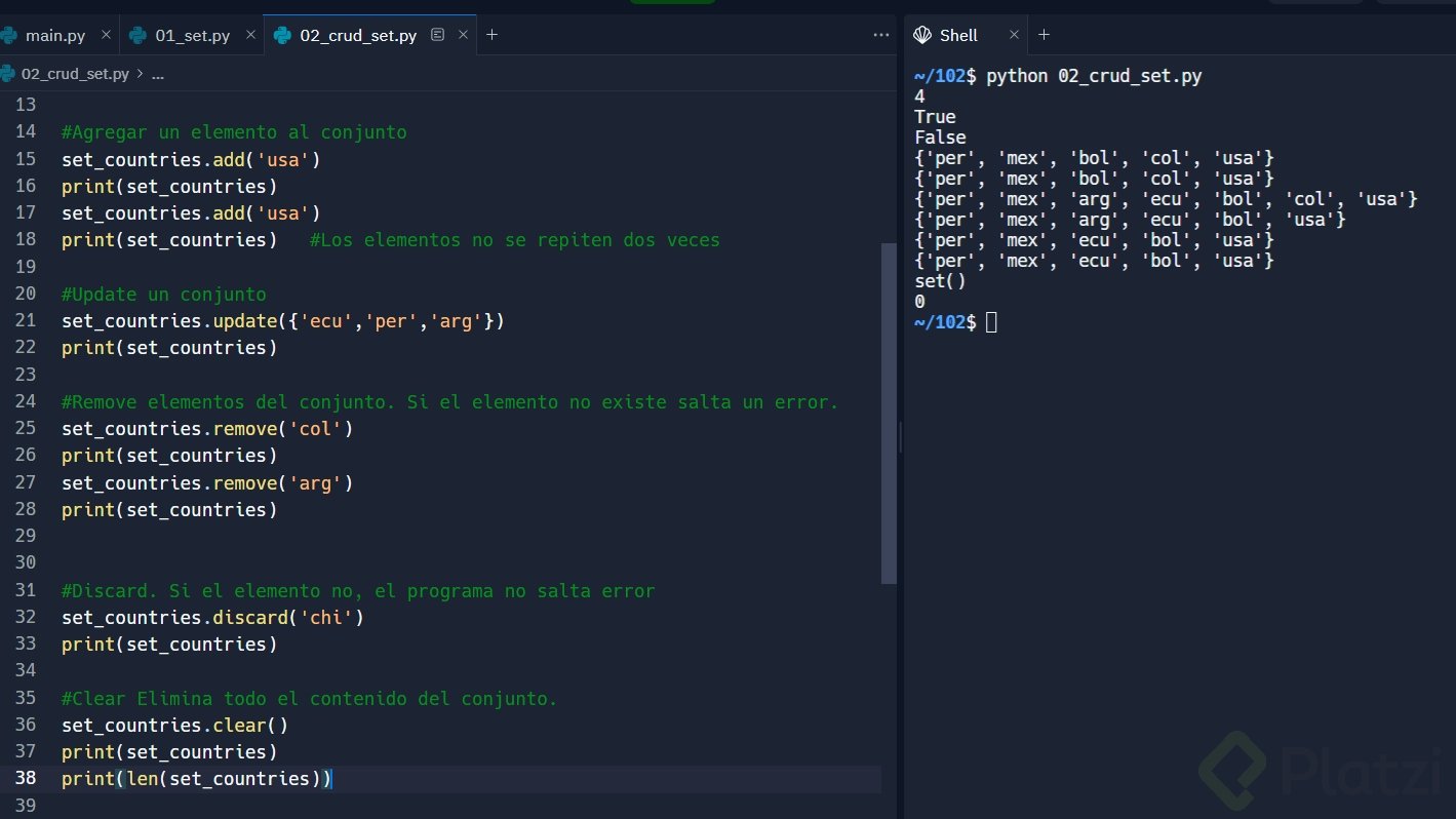 Sin embargo, si eliminamos algo no presente, como ARG, el programa fallará. Para evitar esto y asegurar un manejo más robusto de errores, utiliza discard(). Este método no lanza error si el elemento no se encuentra en el conjunto: