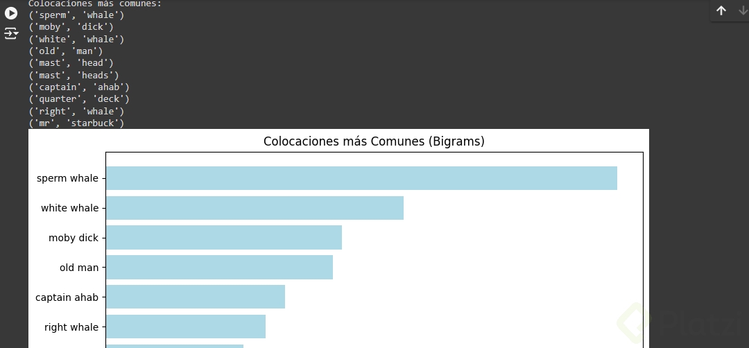 Las colocaciones son combinaciones de palabras que ocurren juntas con más frecuencia de la que esperaríamos por azar. Pueden incluir nombres propios, términos técnicos o combinaciones de palabras que ofrecen más significado juntas que por separado.