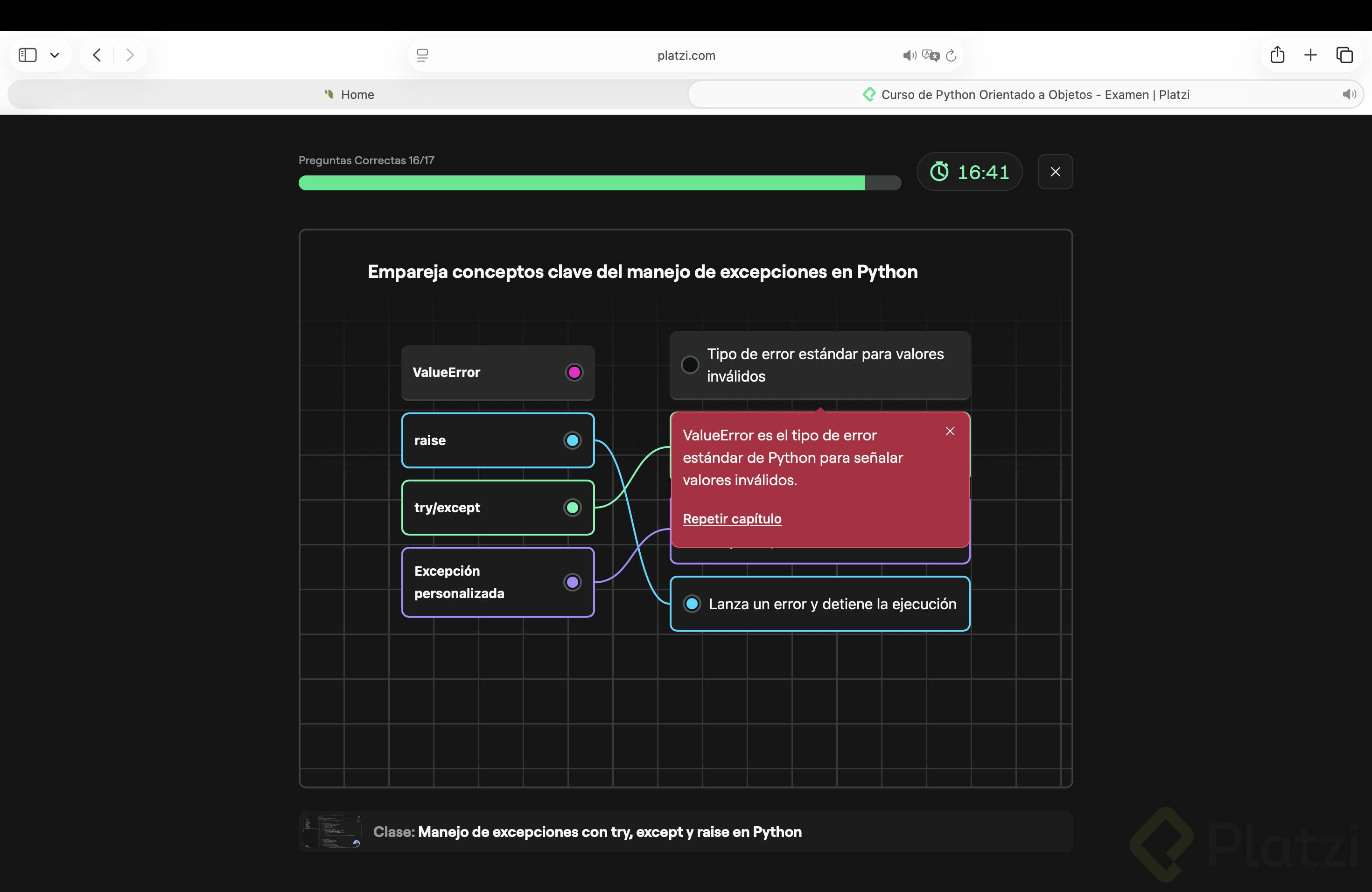 Hola, no pude terminar el examen porque en la pregunta relacionada a la clase manejo de excepciones, en donde dice 'Empareja los conceptos claves de manejo de excepciones en Python', al relacional ValueError con la deficion 'Tipo de error estándar para valores invalidos' no permite la relación entre estos y no me permite terminar el examen.