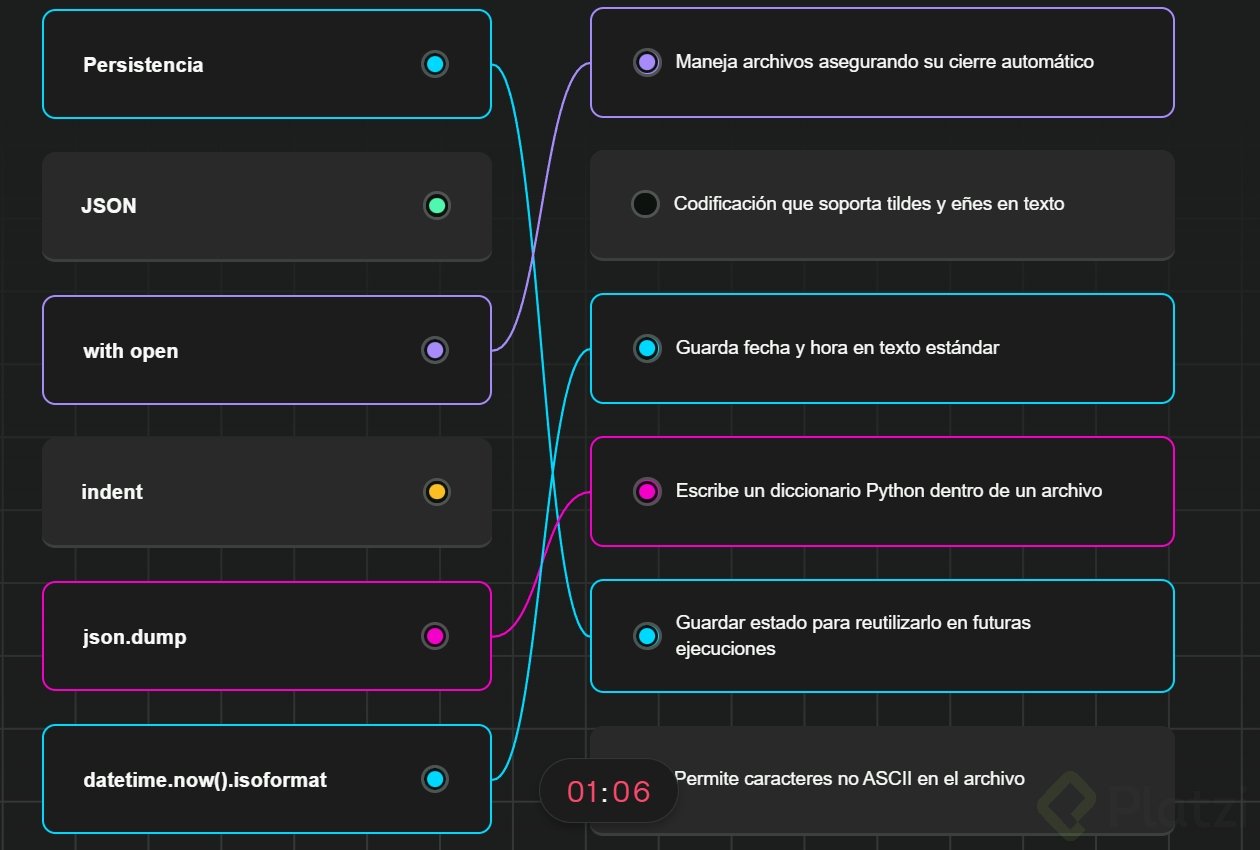 La idea clave: convertir objetos Python a formato JSON serializable, escribirlos en un archivo y, en una fase posterior, cargarlos para reconstruir el estado. Es vital manejar errores y validar datos para evitar inconsistencias.
