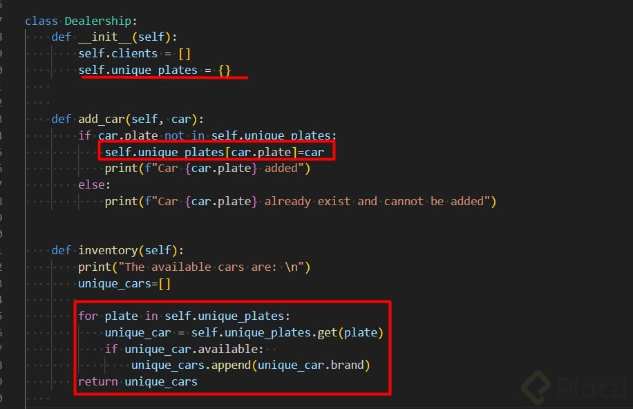 self.disponible =Truedefvender(self):if self.disponible: self.disponible =Falseprint(f"El vehículo {self.marca} ha sido vendido.")else:print(f"El vehículo {self.marca} no está disponible.")defestado(self):return self.disponible