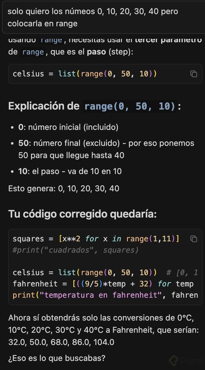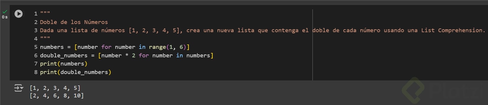 pythonCopiar código numeros = [1, 2, 3, 4, 5] dobles = [x * 2 for x in numeros] print("Dobles:", dobles) -