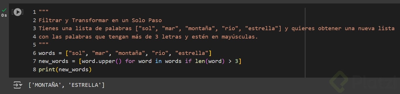 pythonCopiar código palabras = ["sol", "mar", "montaña", "rio", "estrella"] palabras_filtradas = [palabra.upper() for palabra in palabras if len(palabra) > 3] print("Palabras filtradas y en mayúsculas:", palabras_filtradas) -
