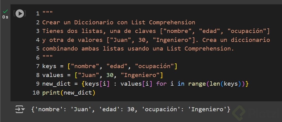 pythonCopiar código claves = ["nombre", "edad", "ocupación"] valores = ["Juan", 30, "Ingeniero"] diccionario = {claves[i]: valores[i] for i in range(len(claves))} print("Diccionario creado:", diccionario) -