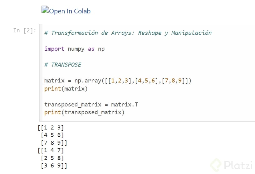 pythonCopiar código matriz = [ [1, 2, 3], [4, 5, 6], [7, 8, 9] ] transpuesta_comprehension = [[fila[i] for fila in matriz] for i in range(len(matriz[0]))] print("Transpuesta con List Comprehension:", transpuesta_comprehension) -
