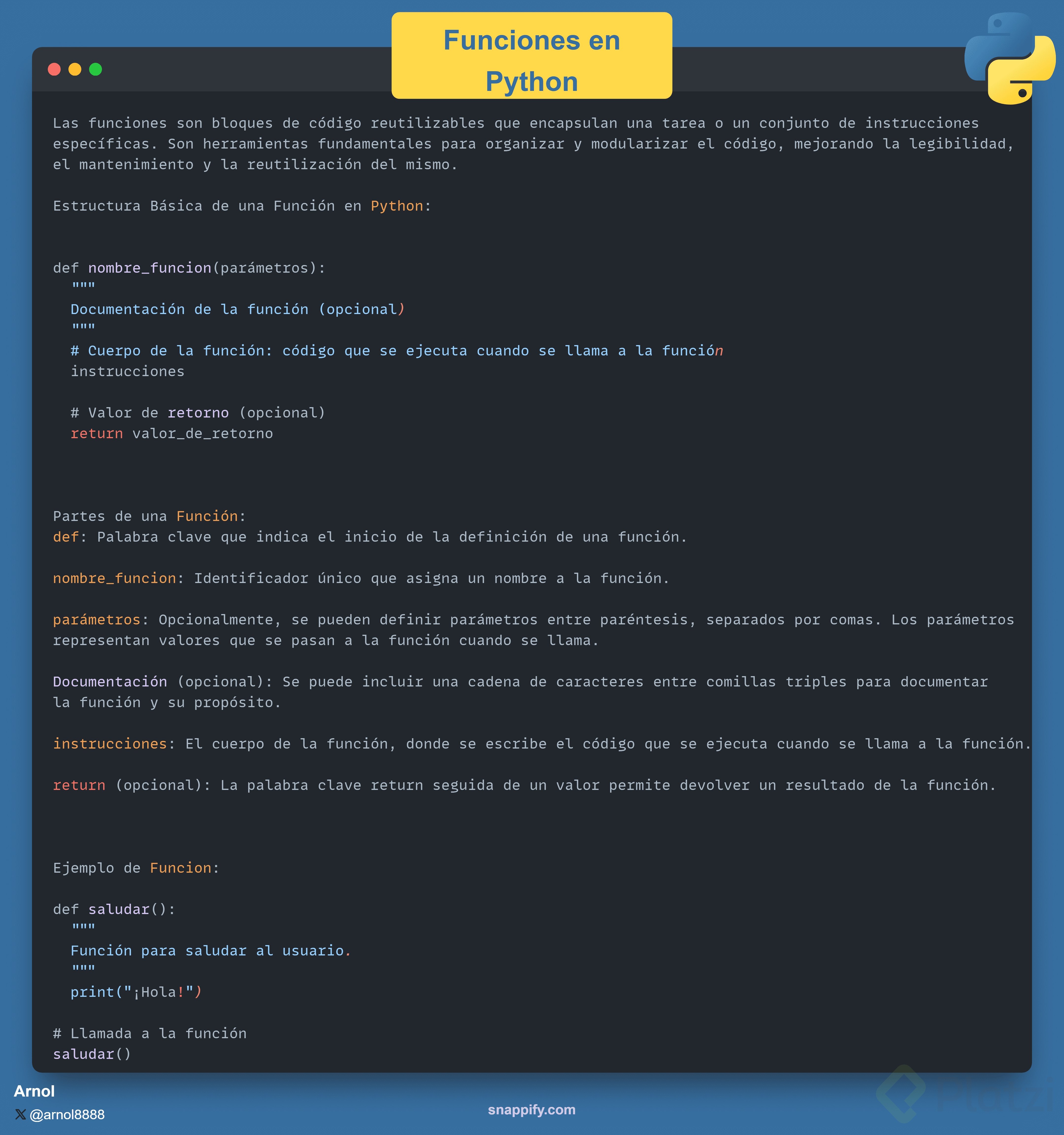 Las funciones en Python se definen utilizando la palabra reservada def, seguida del nombre de la función y los parámetros que representan la información necesaria para su ejecución.