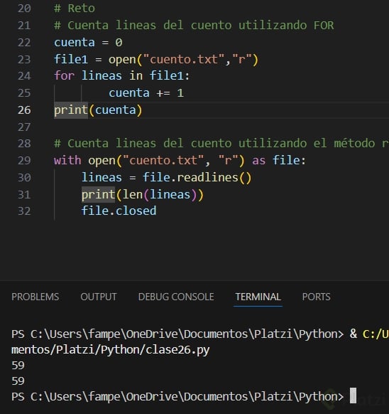 Ahora, te dejo un reto: cuenta el número de líneas en el archivo caperucita.txt y comparte tu resultado en los comentarios. Este ejercicio no solo reforzará tus habilidades, sino que también te acercará a comprender el poder del manejo de archivos en Python.