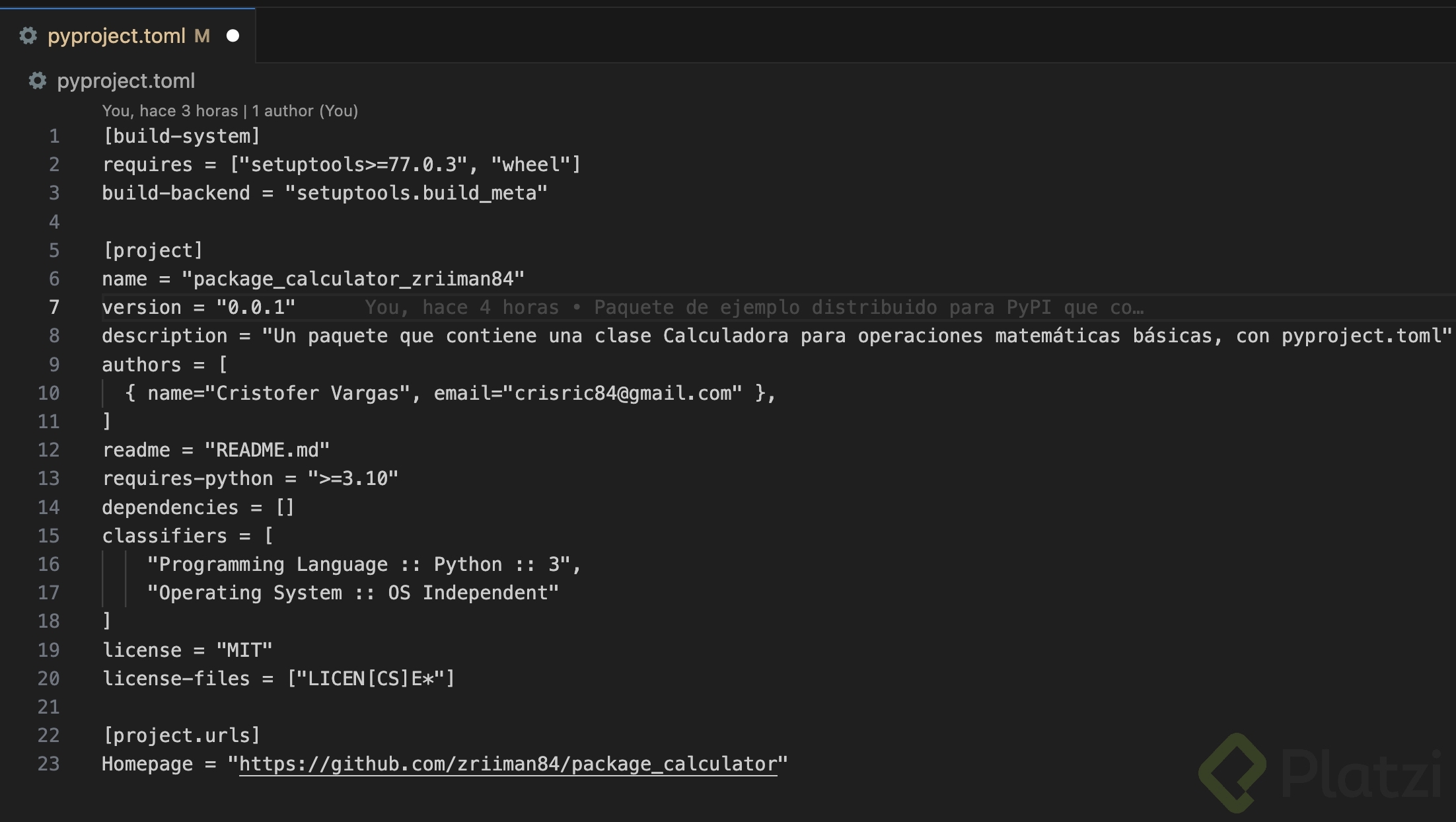 pyproject.toml: Este archivo es clave ya que incluye información esencial del paquete, desde el nombre y versiones compatibles hasta datos del autor. -