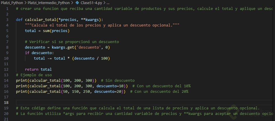 kwargsse almacena como un diccionario.- Ofrece flexibilidad para gestionar múltiples parámetros y modificarlos sin alterar la estructura de la función.