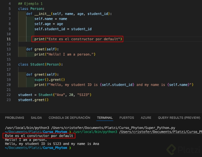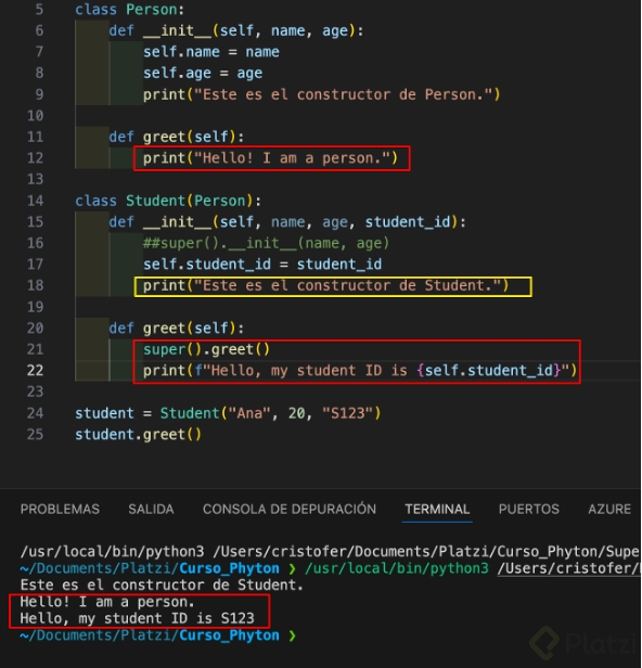 Cuando se crea una subclase Student que hereda de Person, se puede utilizar super() para acceder al constructor de Person y extenderlo, añadiendo atributos propios como student_id: