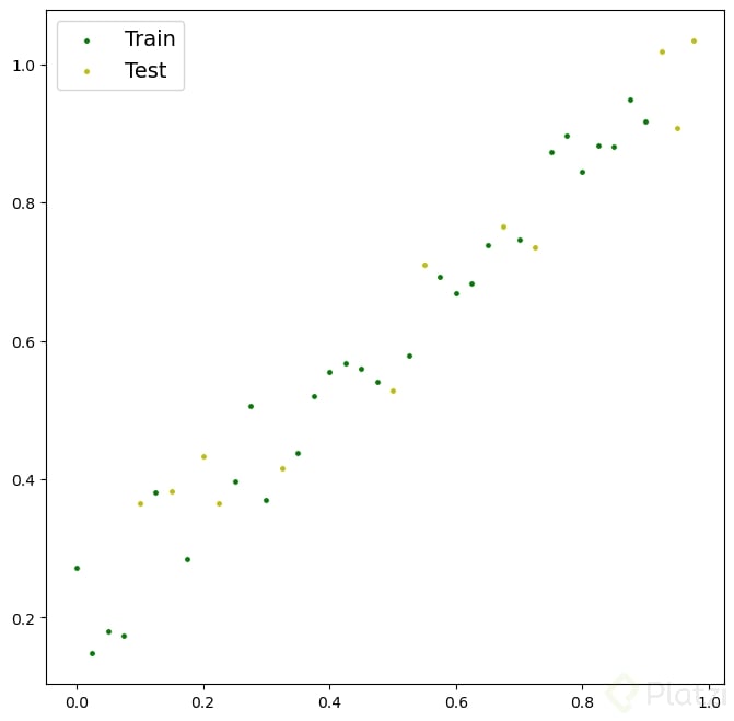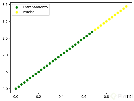 Esta función plot_predictions nos brinda una representación gráfica clara de nuestros datos. Los puntos verdes indican datos de entrenamiento y los amarillos, los de prueba, permitiéndonos visualizar su distribución.