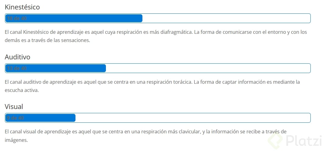Mis resultados del test Visual 17 de 40 Kinestésico 12 de 40 Auditivo 11 de 40