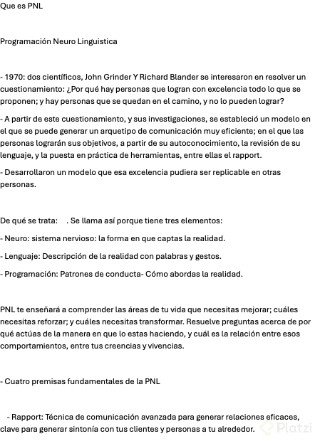 La PNL es una ciencia que está diseñada para apórtate valiosos elementos en el fortalecimiento de los lazos con tus clientes a través de una correcta comunicación. Aportes: Autoconocimiento y logro de objetivos ++Historia:++ Creado en 1970 por dos científicos: John Grinder (lingüista) y Richard Bandler (matemático) se enfocaron en responder un cuestionamiento: ¿Por qué hay personas que logran con excelencia todo lo que se proponen y otros se quedan en el camino? Con sus investigaciones se logró un modelo en el que se puede generar un arquetipo de comunicación muy eficiente en el que las personas lograrán sus objetivos a partir del autoconocimiento, la revisión de su lenguaje y la puesta en práctica de muchas herramientas entre ellas el rapport.