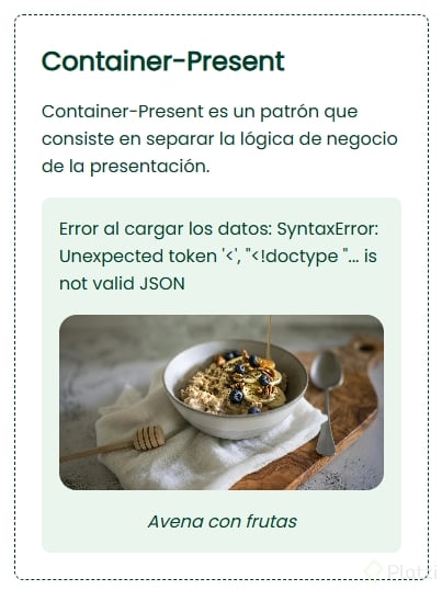 Para manejar el proceso, el contenedor inicializa un estado de loading y error, y actualiza data cuando el fetch es exitoso. También maneja las posibles fallas del fetch a través de un bloque try-catch.