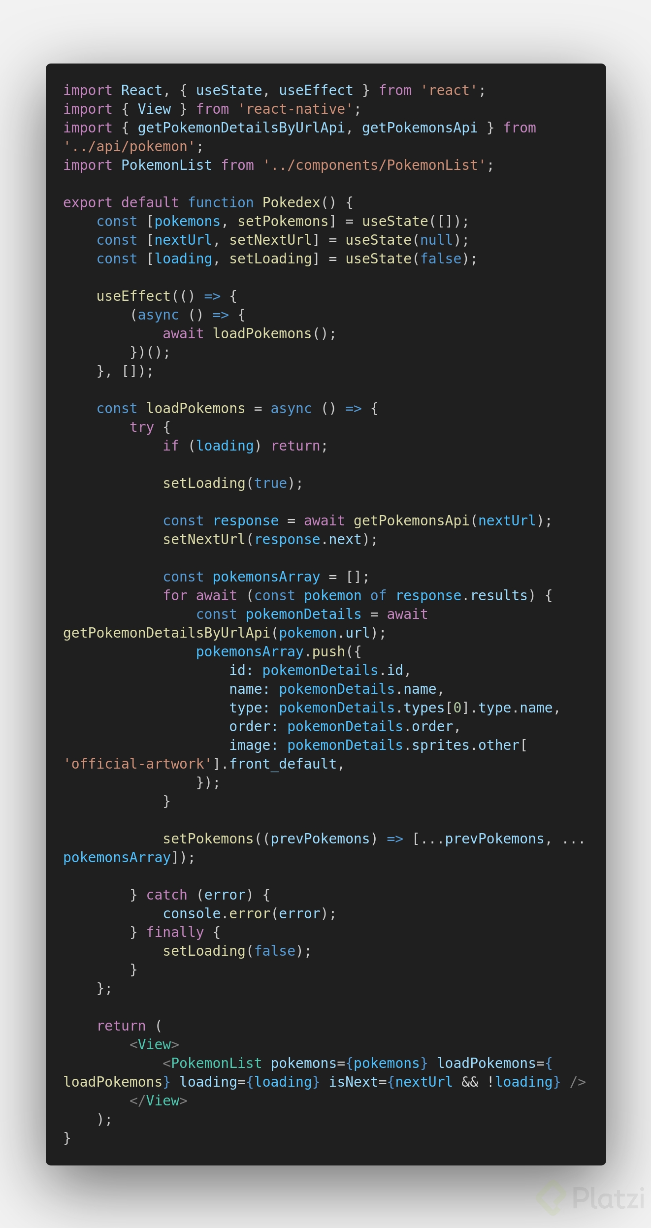 Analizando el error de que se brinca los primeros 20 después de unos segundos, opte por ponerlo después de la captura de los pokemons para evitar que se actualizara antes de mostrarlos les dejo el código y cualquier retroalimentación es bienvenida, ```js const loadPokemons = async () => {