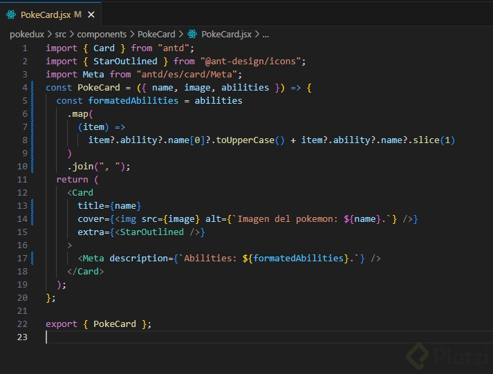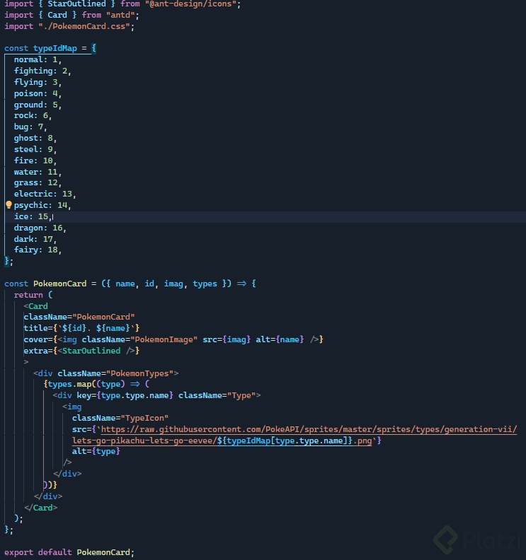 PokémonCard: Ajustamos el componentePokémonCardpara que reciba no solo el nombre del Pokémon, sino también su imagen. Esto implica reemplazar cualquier imagen temporal con la que proporcionamos a través de los detalles.const PokémonCard = ({ name, image }) => ( <div> <img src={image} alt={name} /> <h3>{name}</h3> </div> ); -