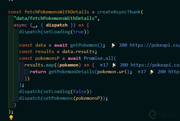 createAsyncThunk:export const fetchPokemonWithDetails = createAsyncThunk( 'data/fetchPokemonWithDetails', async (_, { dispatch }) => { // Aquí ejecutarás tus acciones asíncronas } );