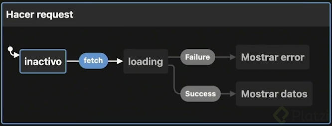- Estados finales: Si el request es exitoso, pasamos al estado donde se muestran los datos del servidor. Si falla, pasamos al estado de error donde se notifica al usuario que algo salió mal.