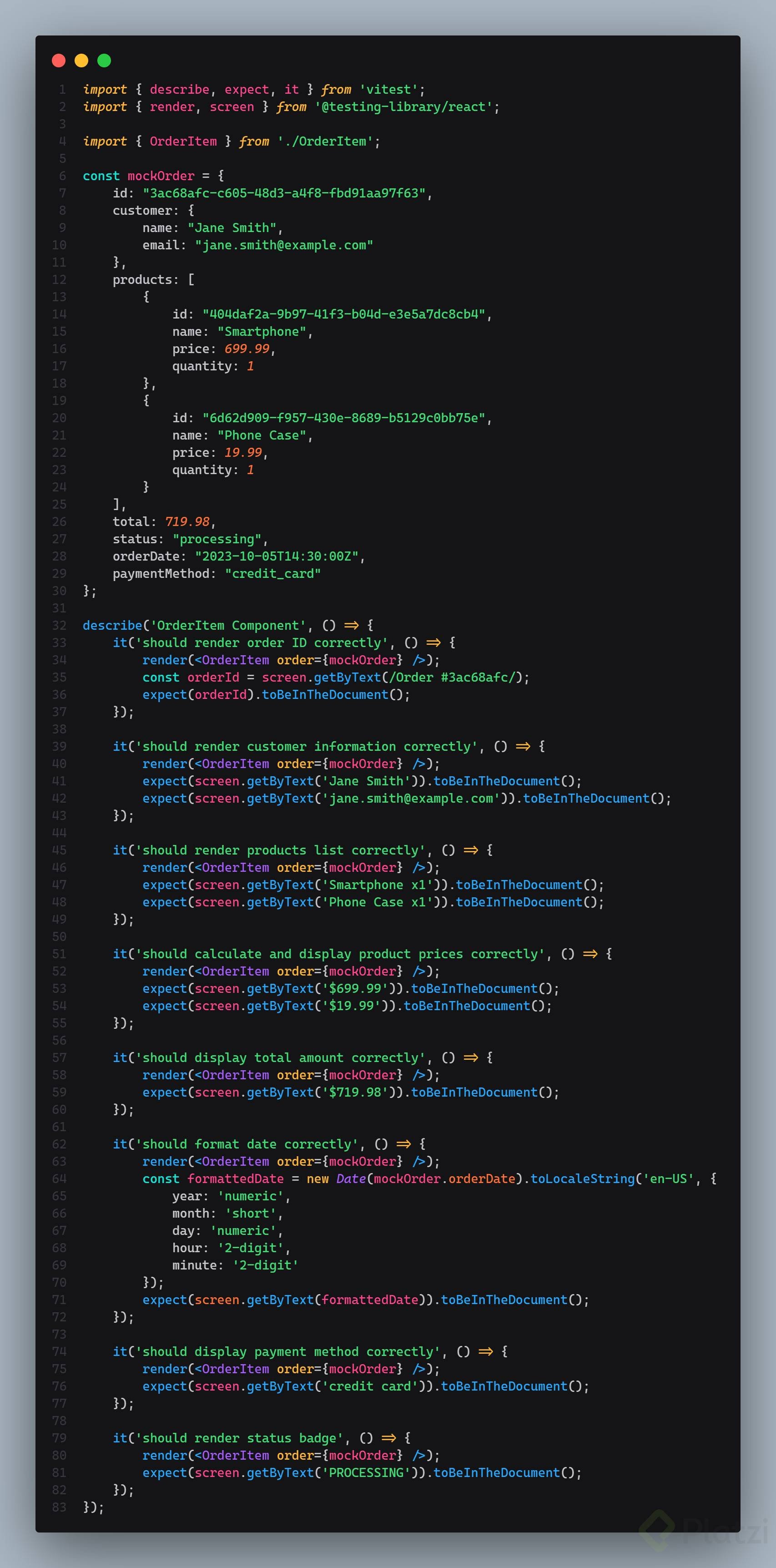 Proporciónale el componente a testear: Copia el componente de la aplicación que deseas probar. Por ejemplo, para la aplicación "Platzi Orders" se copiaría el componente