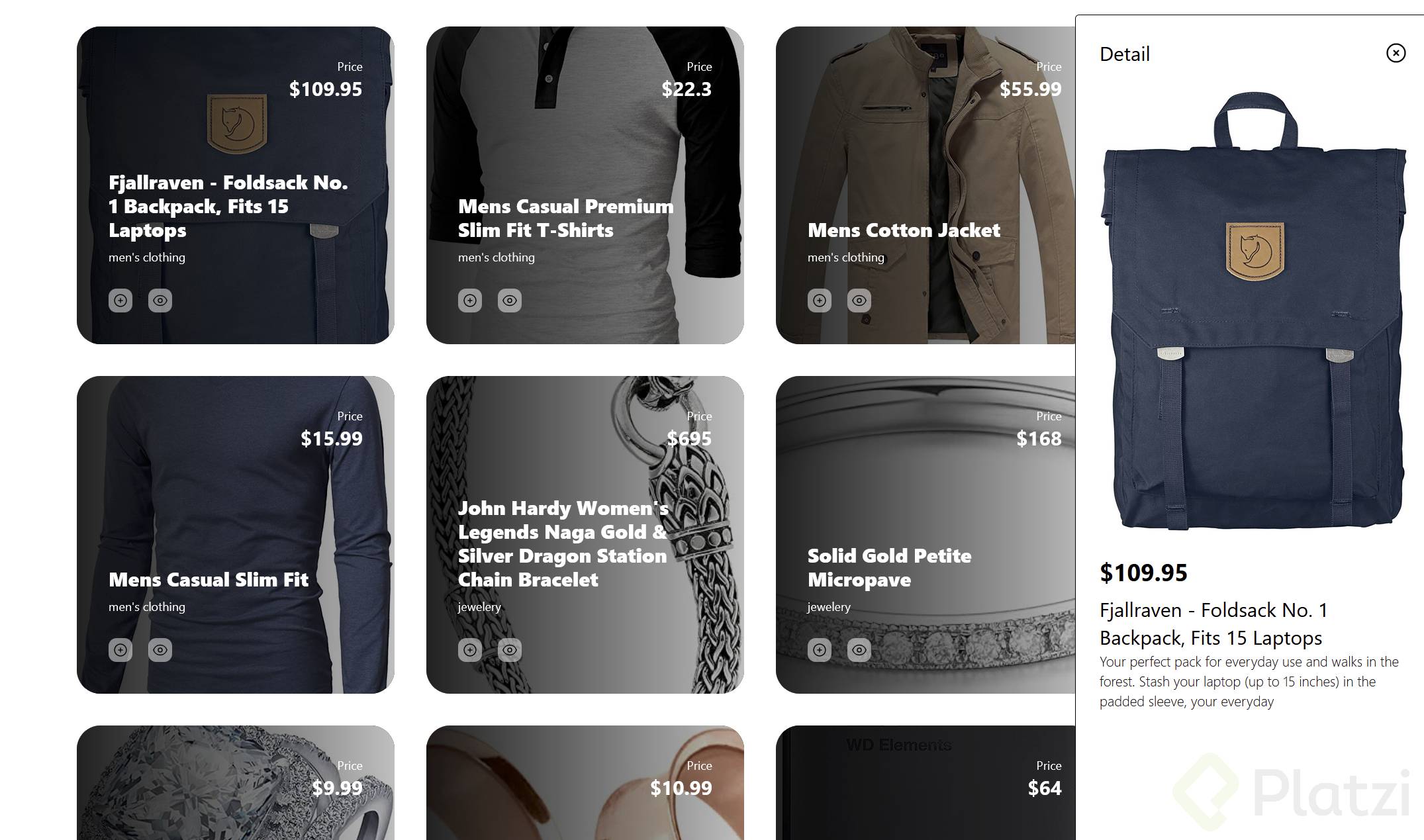 - Incluir el método de click: Asegúrate de que el click en la carta ejecute esta función. Al ejecutarse, la función abrirá el Product Detail y almacenará la información del producto.