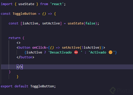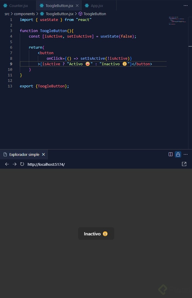 setIsActive(!isActive)para invertir el valor actual del estado (defalseatrueo viceversa). - Empleamos un operador ternario para mostrar "Activo" o "Inactivo" según el valor de