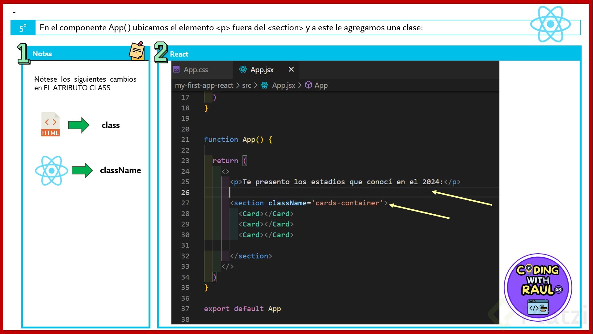 classNameen lugar declasspara asignar clases CSS - Requiere que las etiquetas se cierren correctamente (incluso las de autocierre como