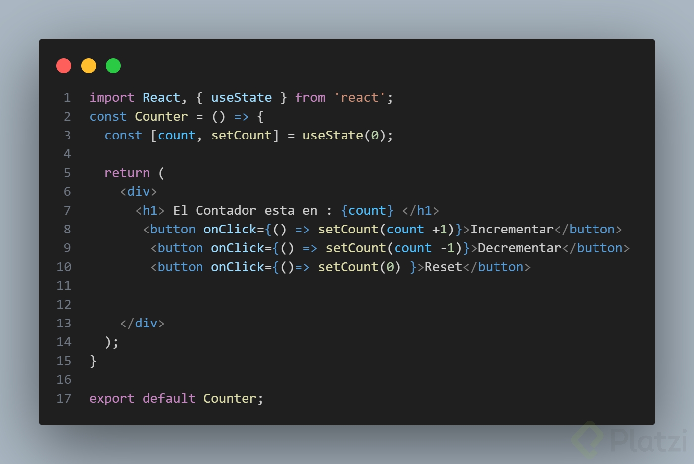 Vamos a crear un ejemplo práctico: un contador que nos permita incrementar y decrementar un valor utilizando estados locales.