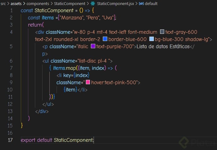 Vamos a crear un componente sencillo que muestre una lista de frutas utilizando datos estáticos. Este ejemplo ilustra perfectamente cómo trabajar con información que no cambiará durante la ejecución de nuestra aplicación.