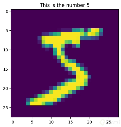 plt.imshow(x_train[0])# Changed'srt' to 'str' to convert the integer to a string.title_string="This is the number {}".format(y_train[0])plt.title(title_string) # Added title to the plot